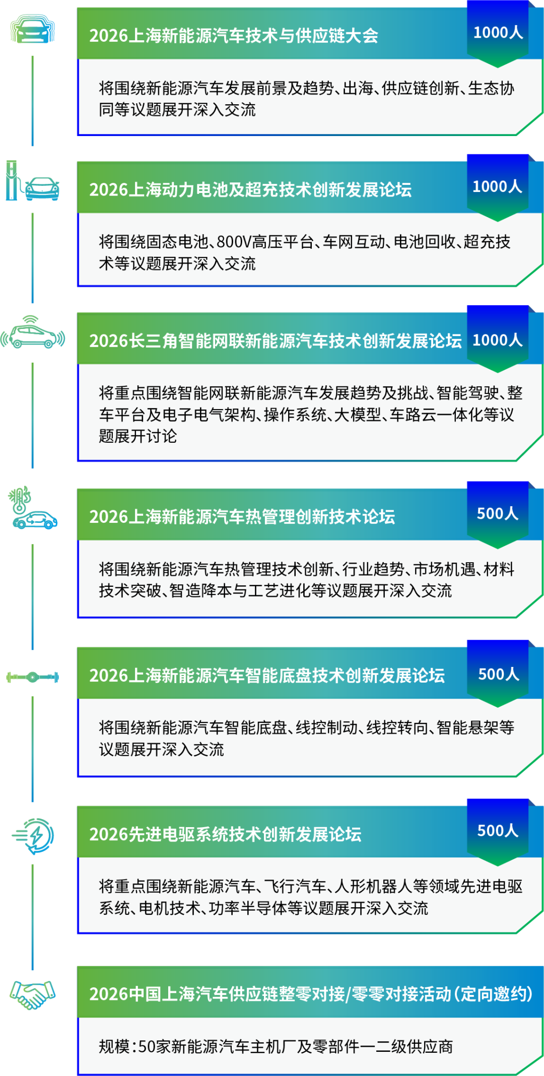 包含“上海新能源汽车技术与供应链大会”、“动力电池与超充技术论坛”等多场重磅活动,邀请200+行业领袖与专家,深度解析固态电池、800V平台、智能底盘、车载算力架构等前沿趋势。