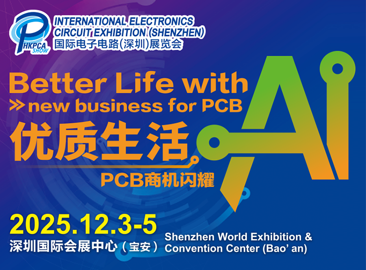 2025深圳电子电路展HKPCA Show将于12月3-5日在深圳国际会展中心(宝安)举办,本届展会以“优质生活・AI-PCB商机闪耀”为主题,呈现AI驱动下的PCB全产业链创新盛宴。