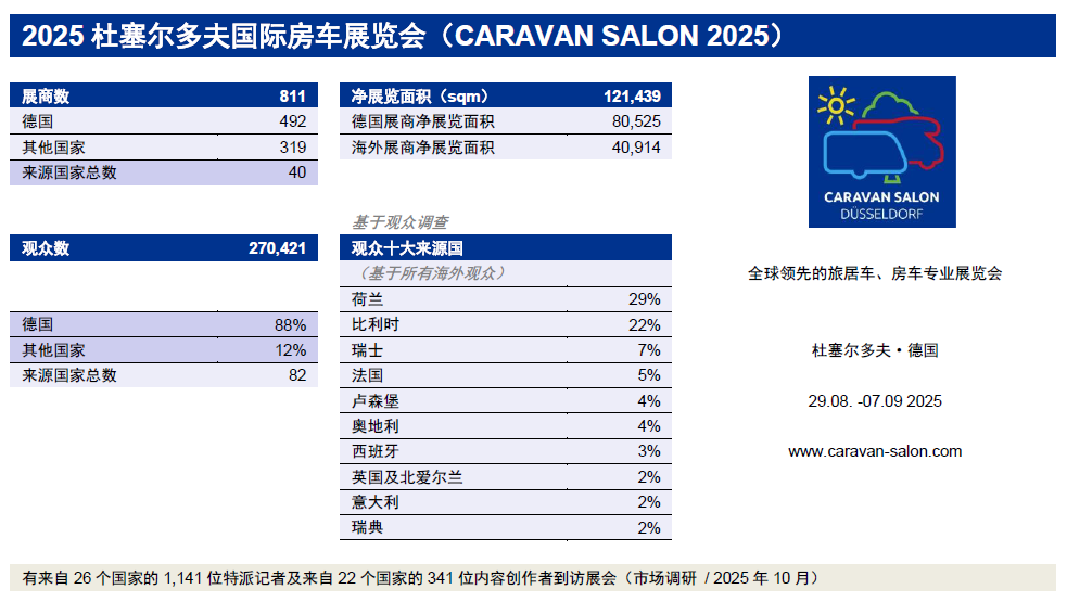 回顾CARAVAN SALON 2025,共有来自82个国家和地区的27万名观众共同见证了这场展会的辉煌成绩。在15个展馆中,有40个国家的811家参展商竞相展示了他们的新产品与创新成果。