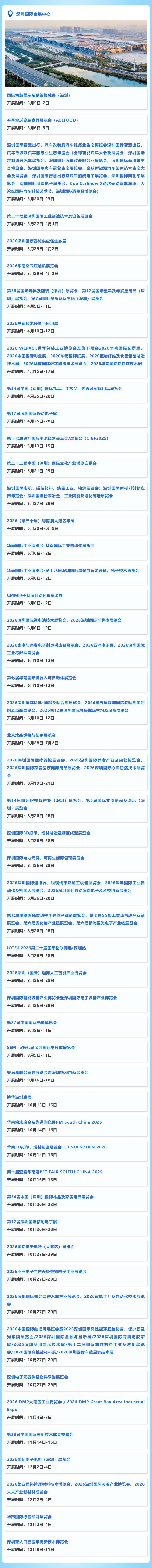 注:以上信息仅供参考,展会可能存在延期、变更等情况,请以各展会官网、展馆官网公布信息为准,观展参展前请核实最新信息。