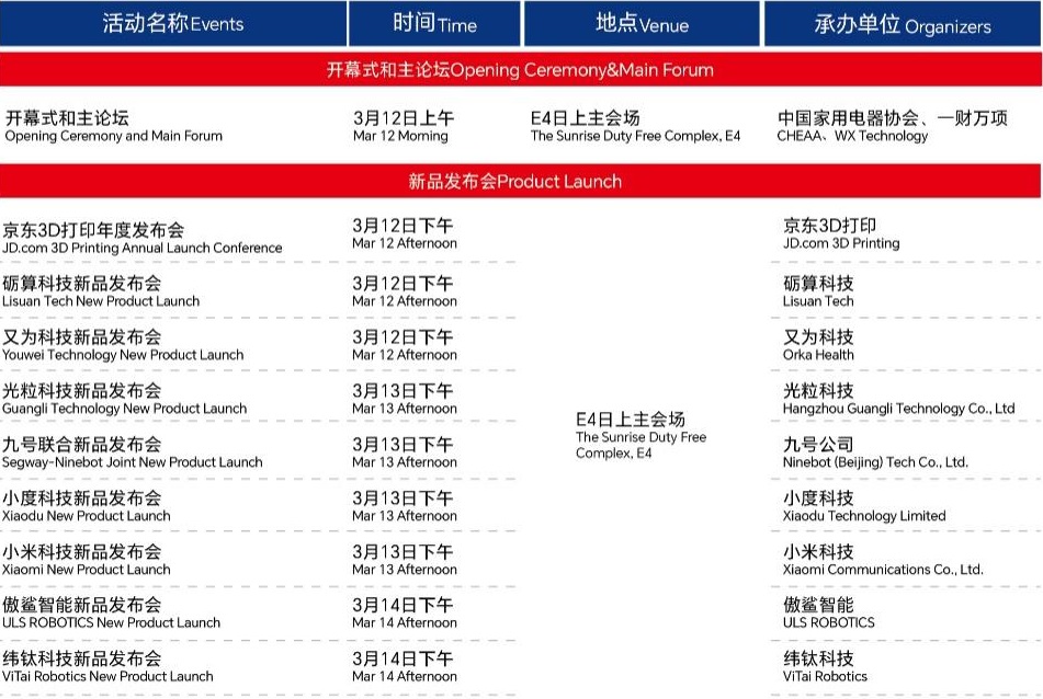 中央大厅还将举行多场新品发布活动,京东3D打印、砺算科技、光粒科技、九号公司、小度科技、小米科技、傲鲨智能等企业将集中发布创新成果。