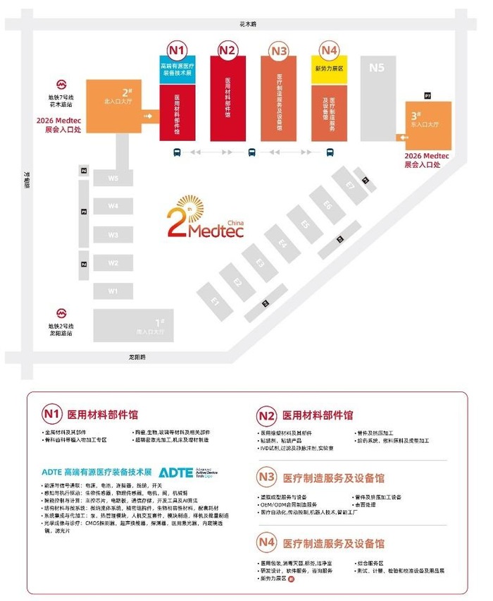2026Medtec中国展展出面积由45000㎡提升至47000㎡,预计汇聚1100+参展企业。四大展馆实现精准功能分区: