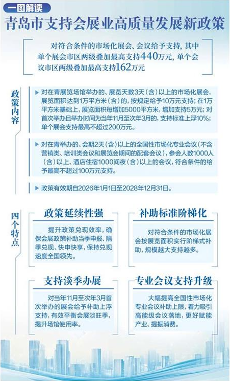 为了进一步放大会展经济效应,青岛推出叠加支持政策。符合条件的展会和会议,市区两级最高可分别获得440万元和162万元支持。更关键的是,这一轮政策强调“精准发力”,既覆盖重点展会,也兼顾消费类活动和国际化项目。
